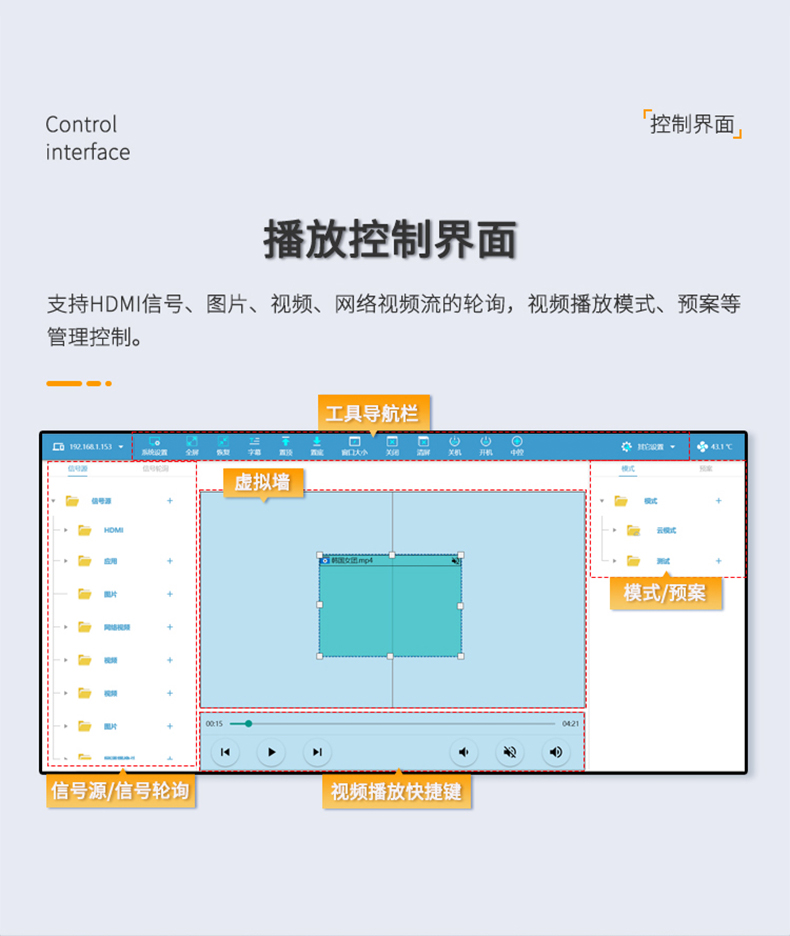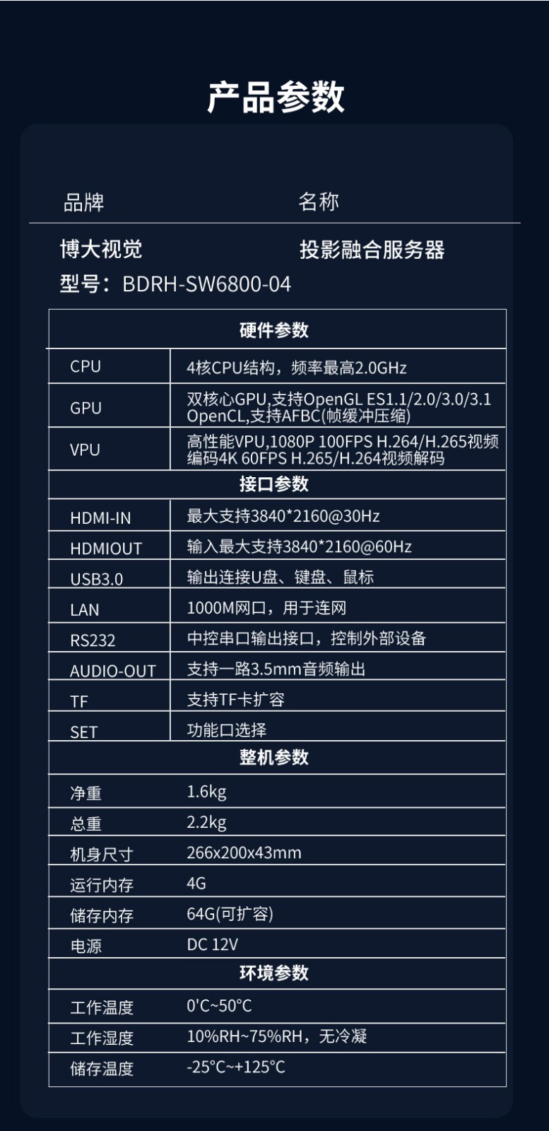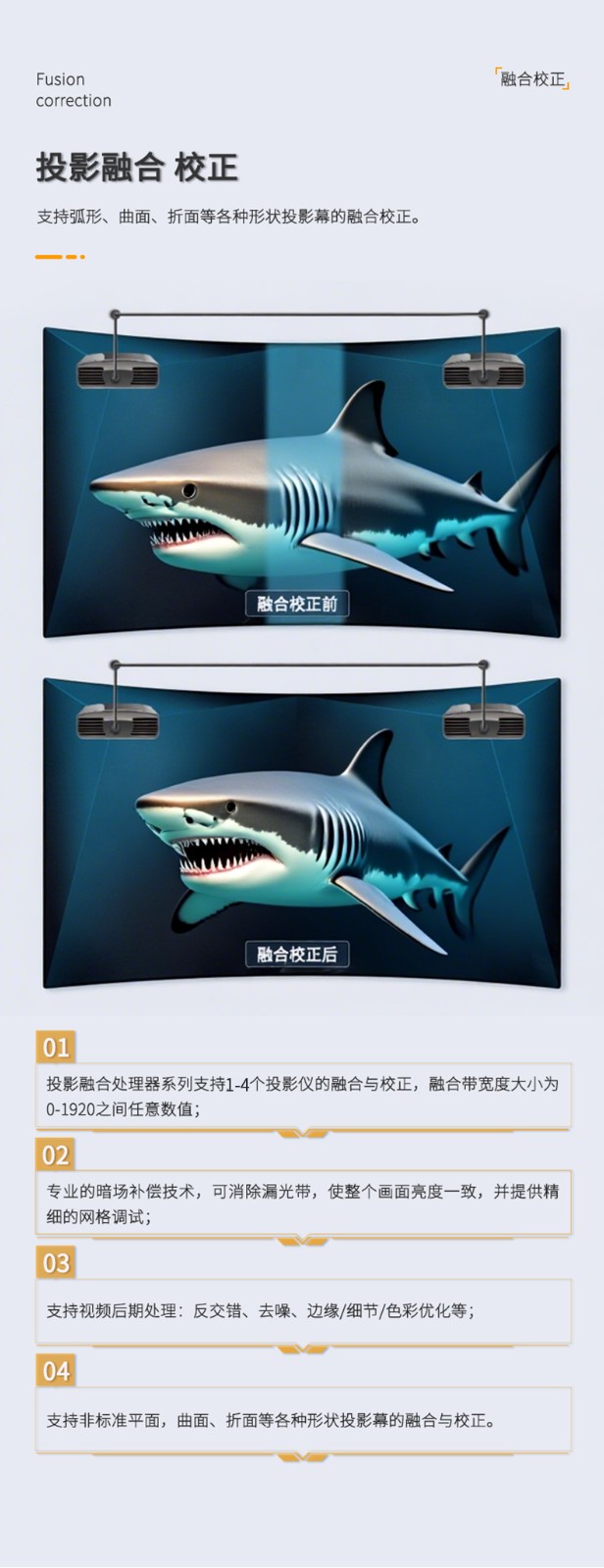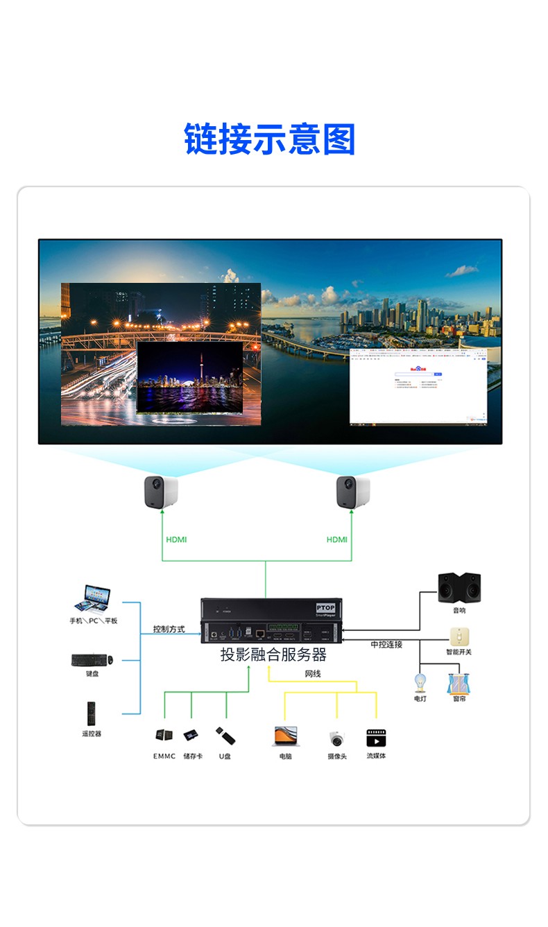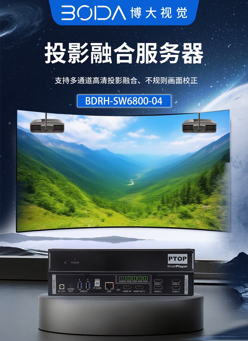 投影融合服务器是专为投影机推出的一款专业的桌面图像融合硬件,通过图像几何校正与边缘融合技术,实现了多通道投影图像融合,支持平面投影及曲面投影。集多媒体播控、信息发布、集群管理功能和应用平台为一体,具备强大的交互和播放能力,该设备最带支持2-4通道。