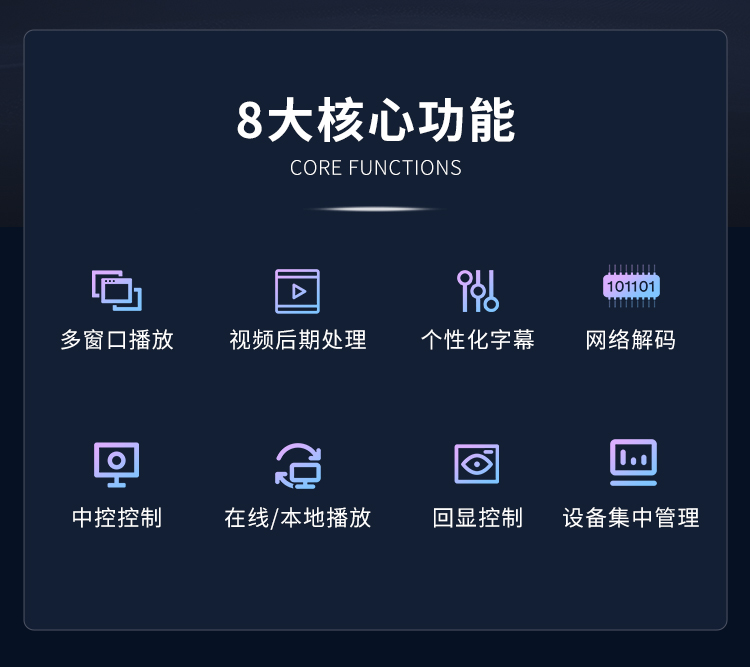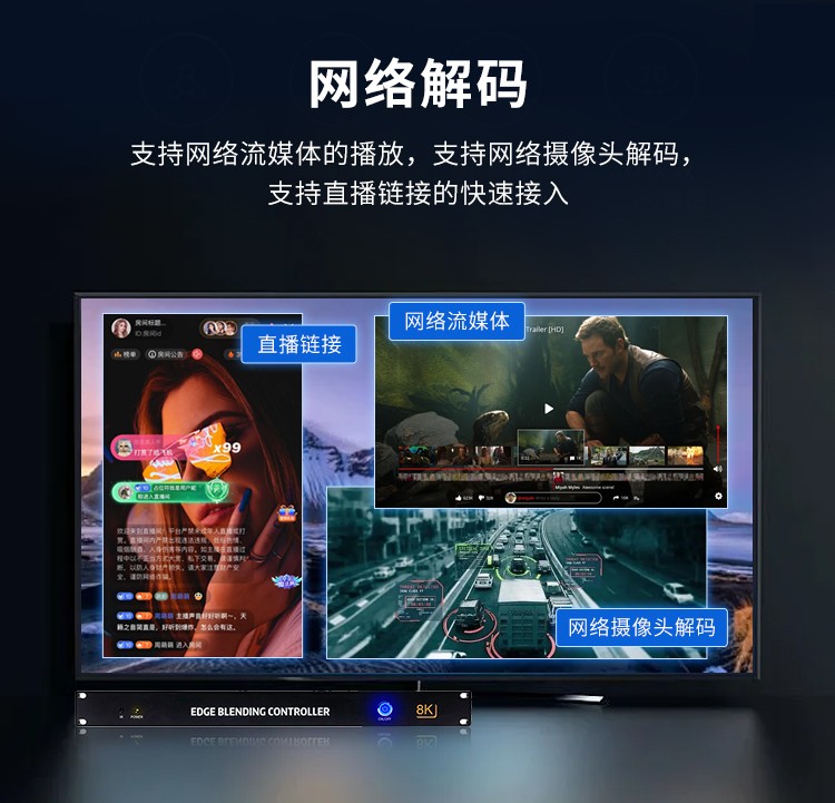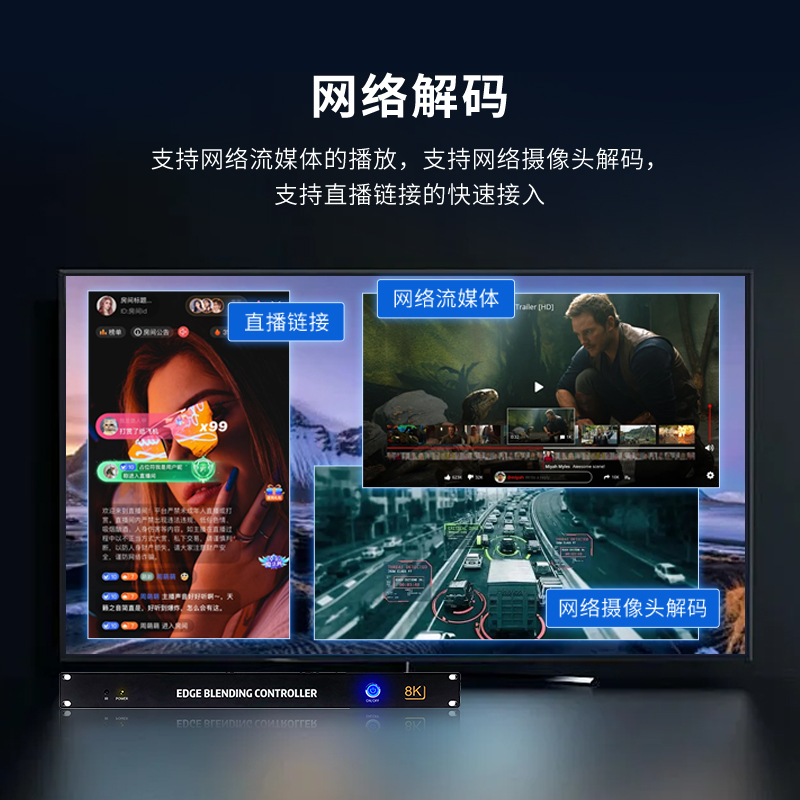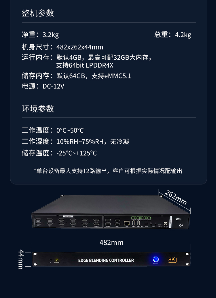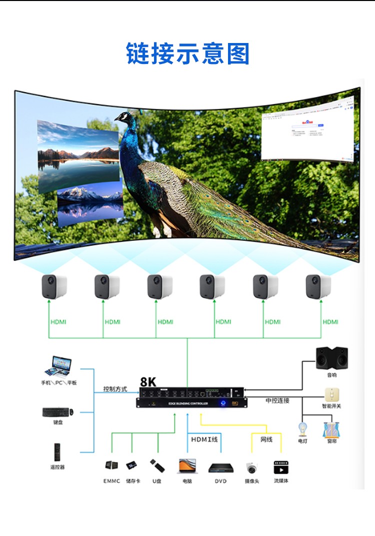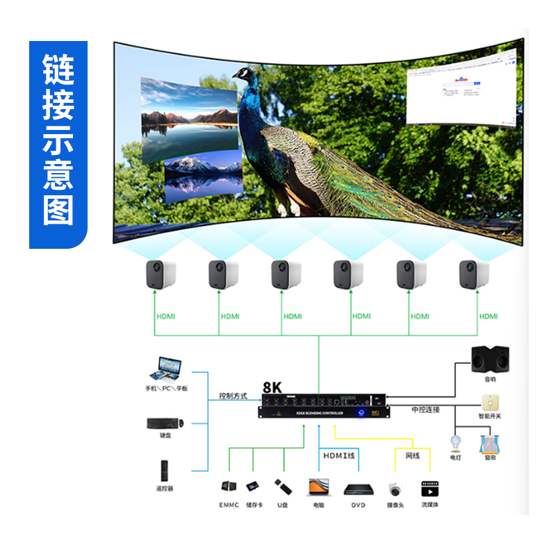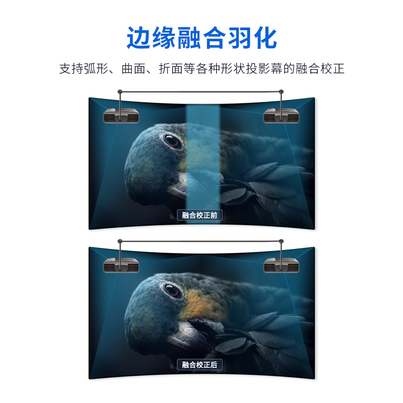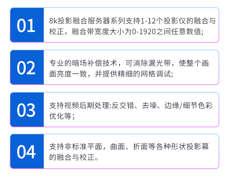 投影融合服务器是一款专业的8K桌面图像融合硬件,通过图像几何矫正与边缘融合技术,实现了多通道投影图像融合,支持平面投影及曲面投影。集多媒体播控、信息发布、集群管理功能和应用平台为一体,具备强大的交互和播放能力。支持Windows、Mac OS、iOS、Android多平台终端控制,可实现多画面任意开窗、漫游显示。同时,针对不同应用场景需求,支持对接视频会议系统、监控系统、网络直播、本地媒体播放,提供2种场景模式(桌面模式、开窗模式),让文档演示、视频播放、远程会议,都能匹配最佳显示效果,该设备最大支持到12通道。