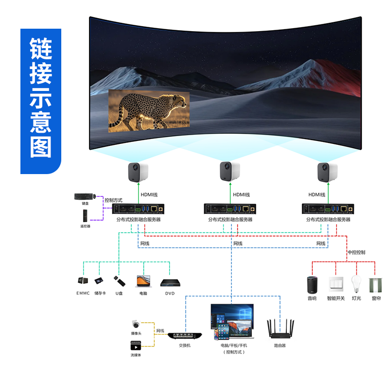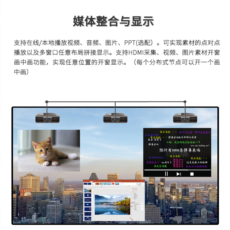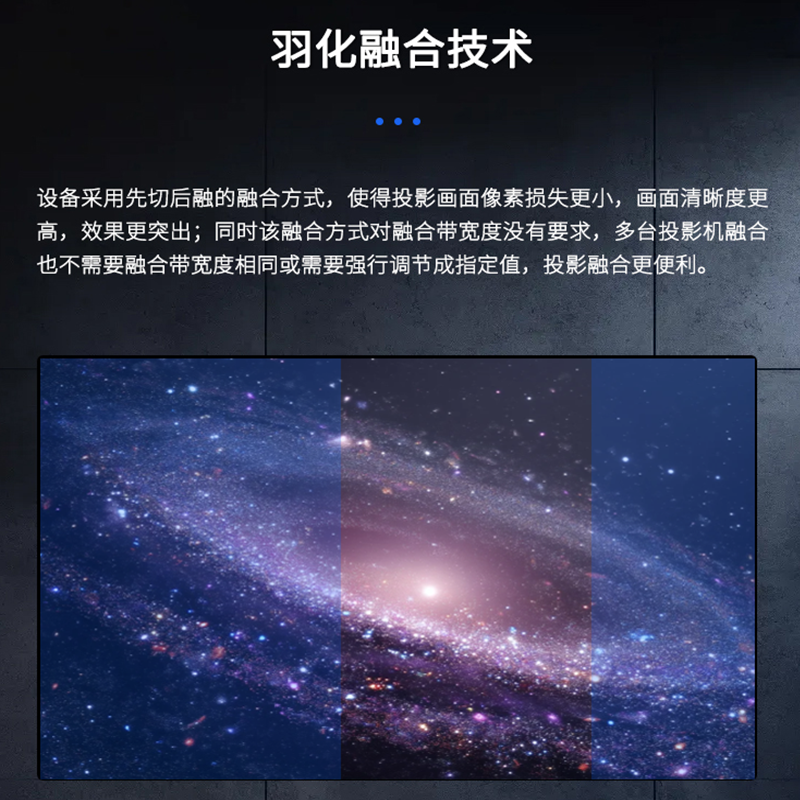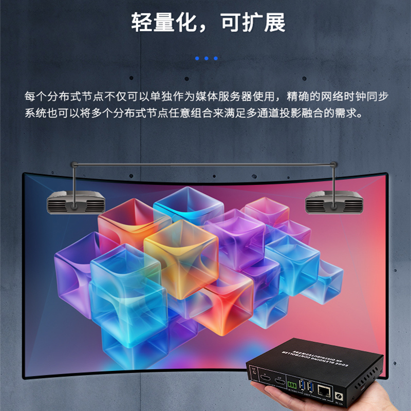 分布式投影融合服务器是一款专业的桌面图像融合硬件。是完全可以取代传统PC的高性能、轻量化、分布式媒体服务器,集调试、播控、信息发布、集群管理功能和应用平台于一体的投影解决方案。支持Windows、Mac OS、iOS、Android多平台终端控制,可实现多画面同时显示。同时,针对不同应用场景需求,支持对接视频会议系统、监控系统、网络直播、本地媒体播放,支持文档演示、视频播放、远程会议,都能匹配最佳显示效果。