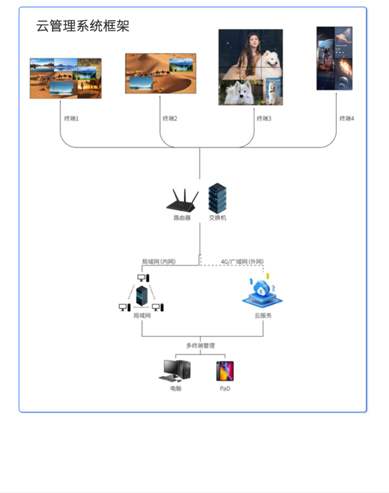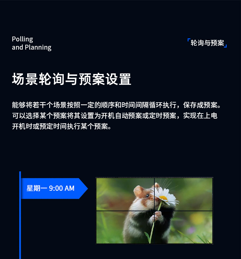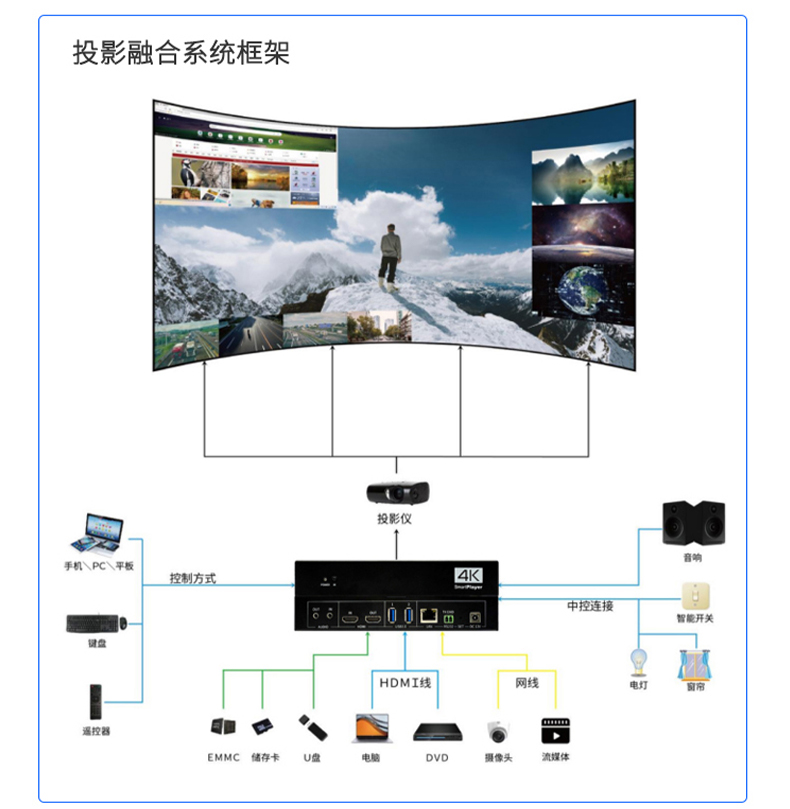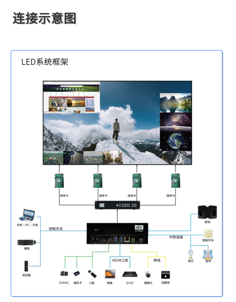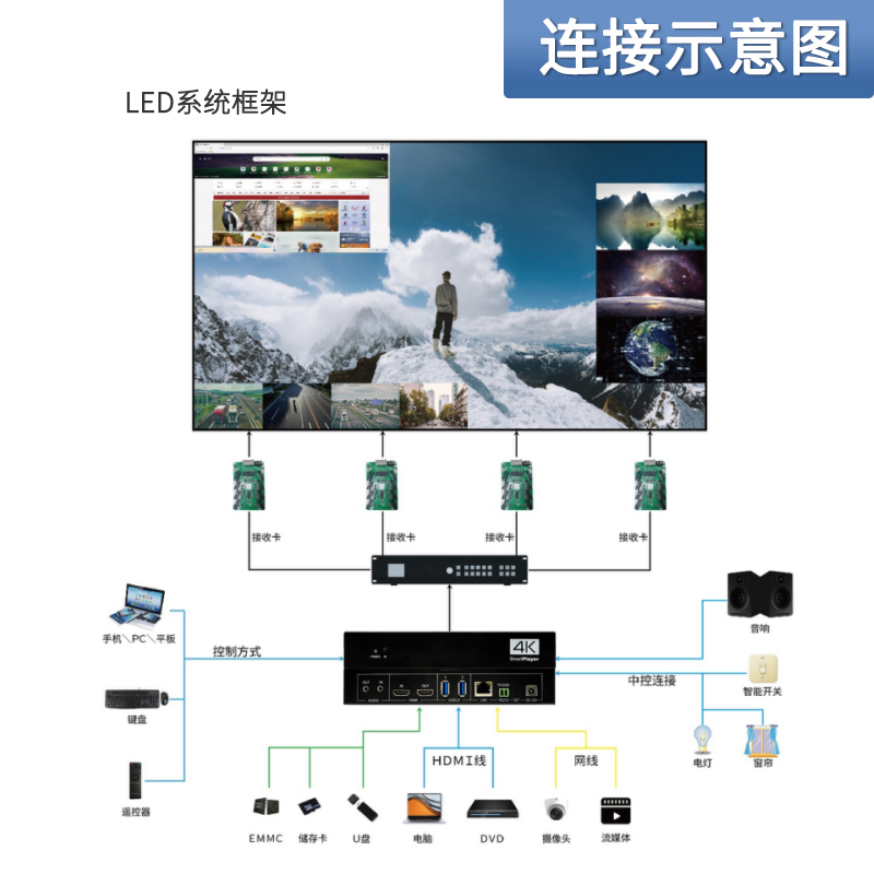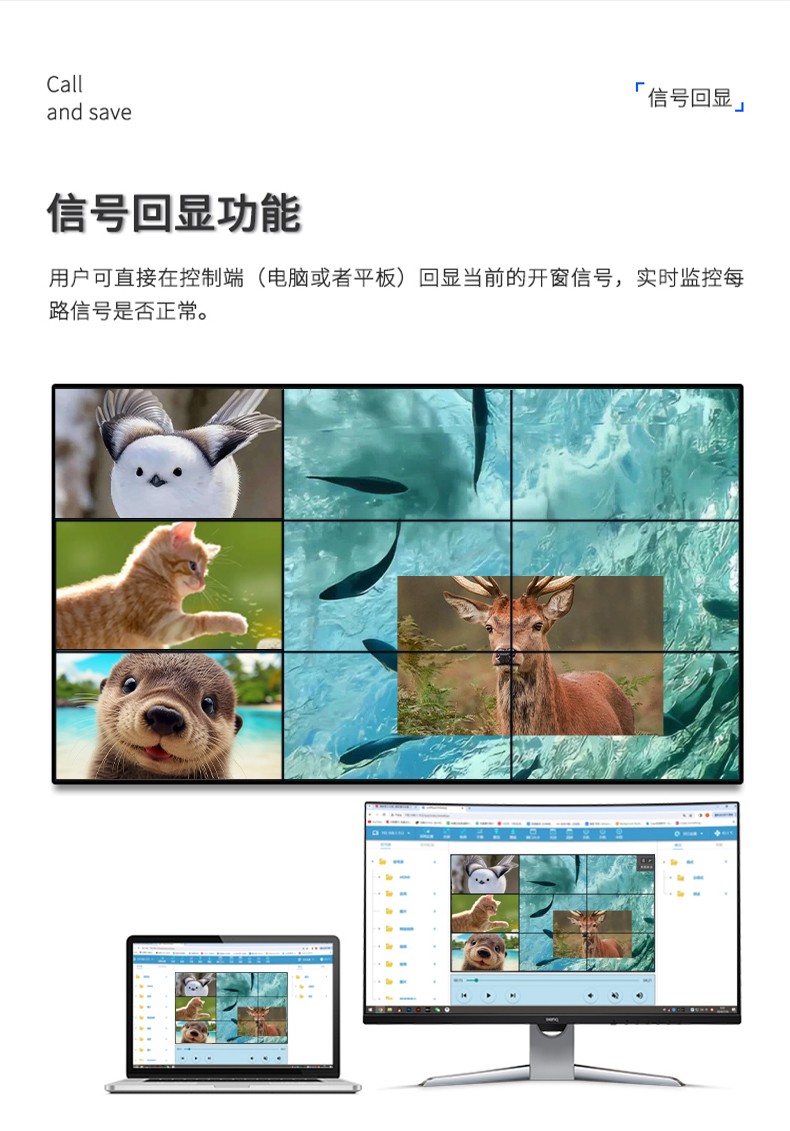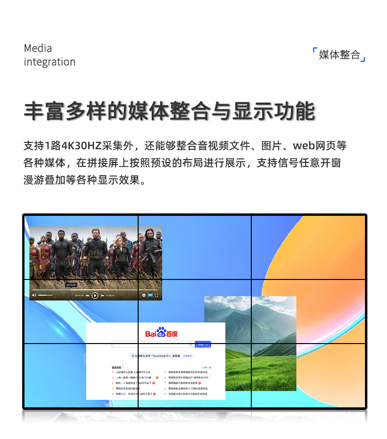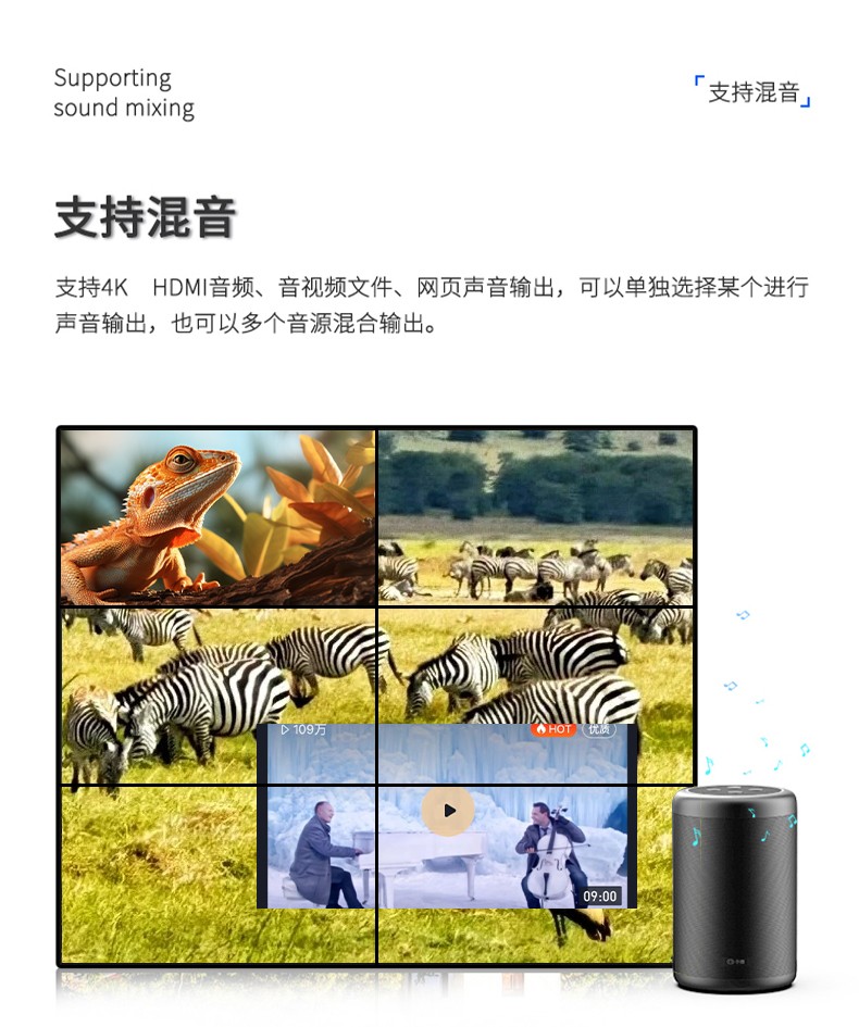 公司专为LCD、LED小屏显示推出的一款专业的MINI播控服务器,集多媒体播控、信息发布、集群管理功能和应用平台为一体,具备强大的交互和播放能力。 支持Windows、Mac OS、iOS、Android多平台终端控制,可实现多画面任意开窗、 漫游显示。同时针对不同应用场景需求,支持对接视频会议系统、监控系统、网络直播、 本地媒体播放,提供2种场景模式(桌面模式、开窗模式),让文档演示、视频播放、远程会议,都能匹配最佳显示效果。 产品支持红外遥控、鼠标、平板、手机、电脑控制,可以广泛用于政企、酒店设计、医疗、教育等行业的商显场景。