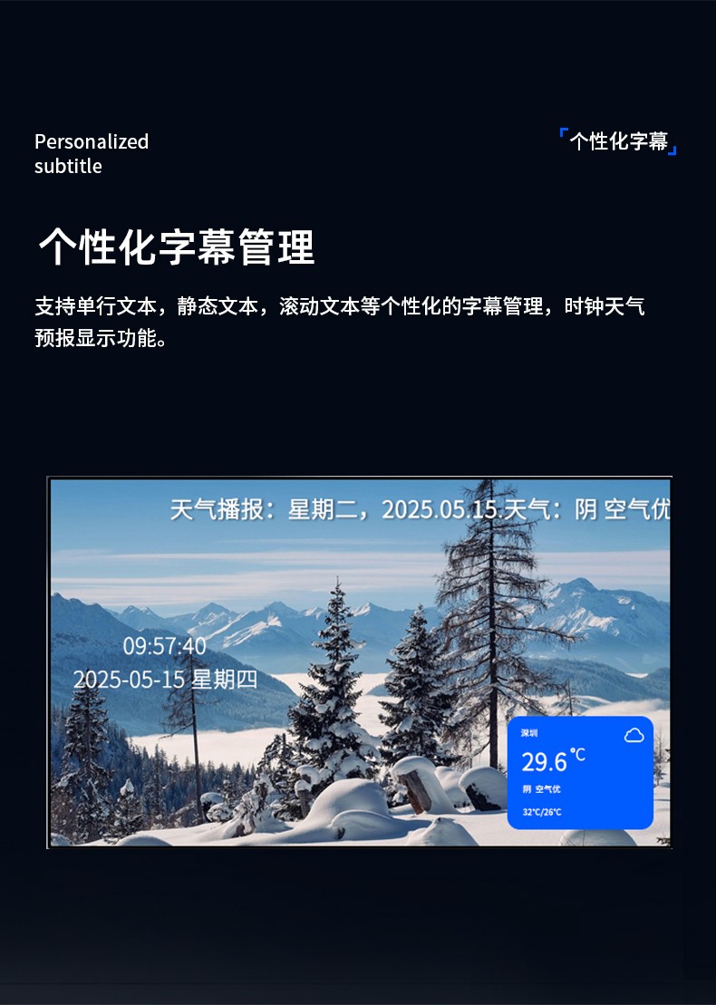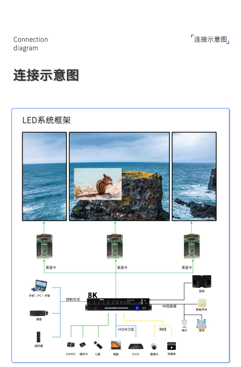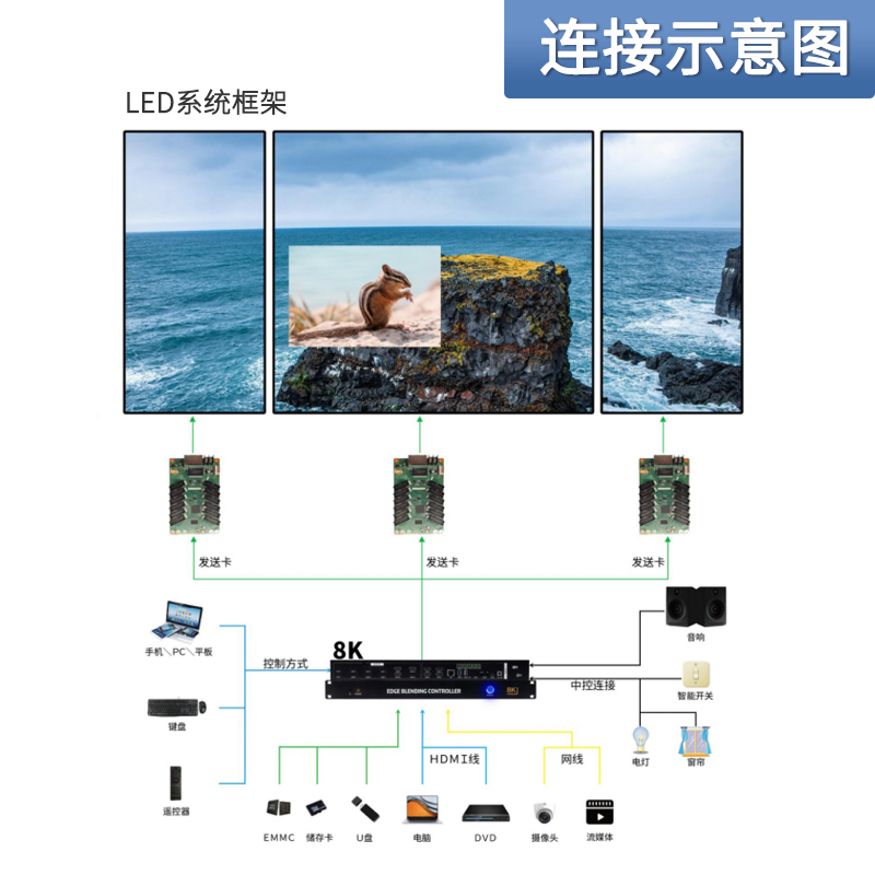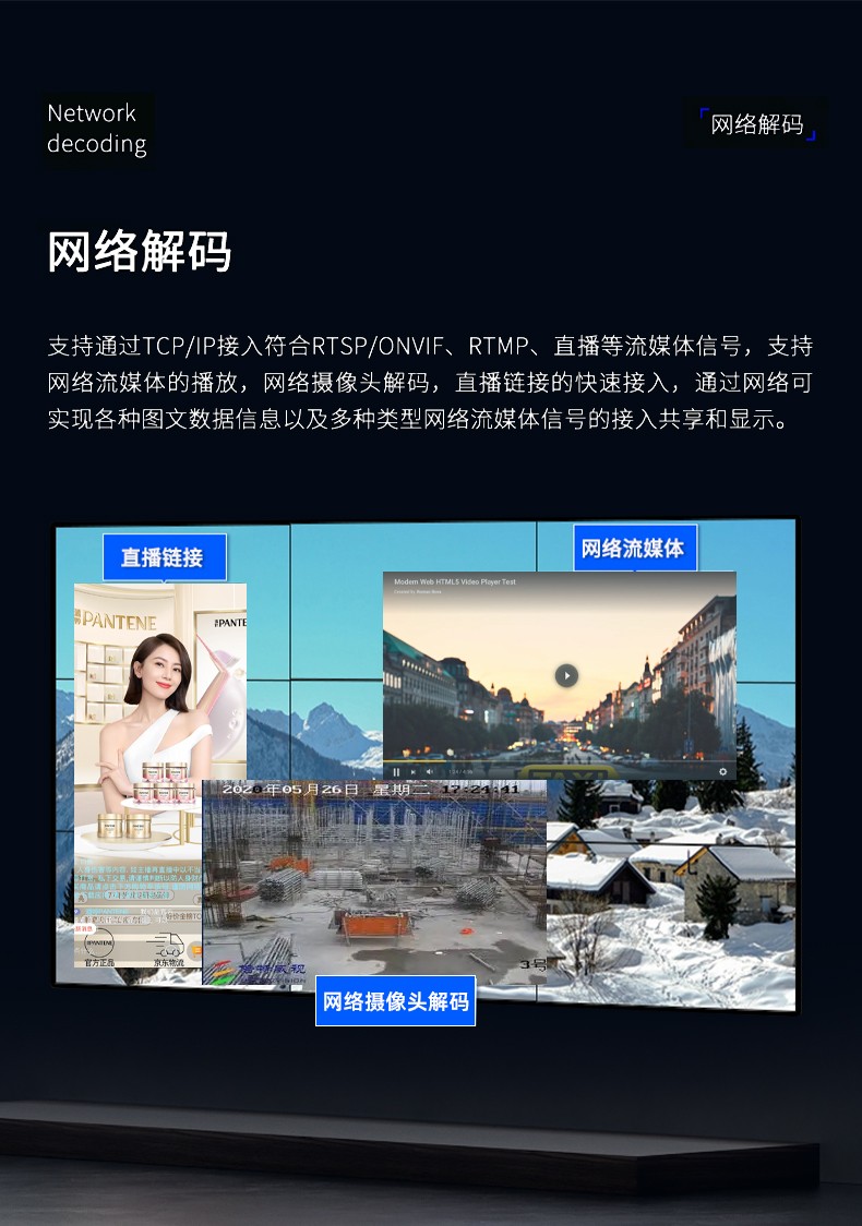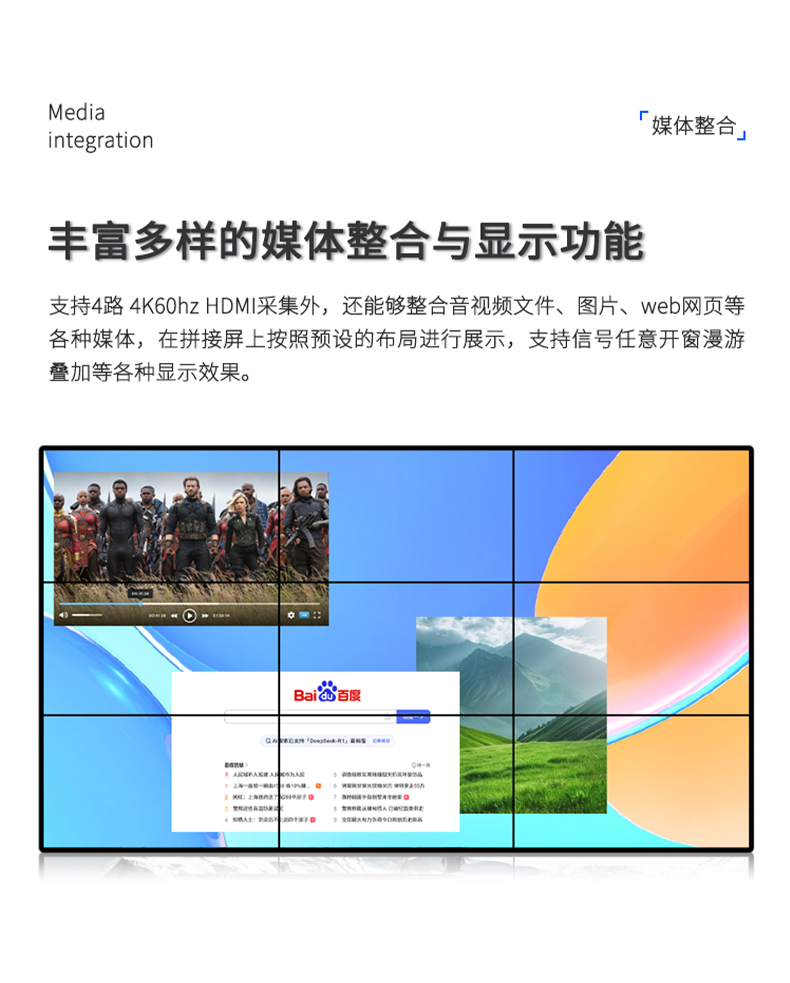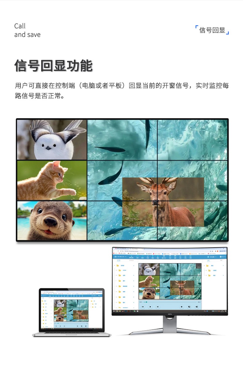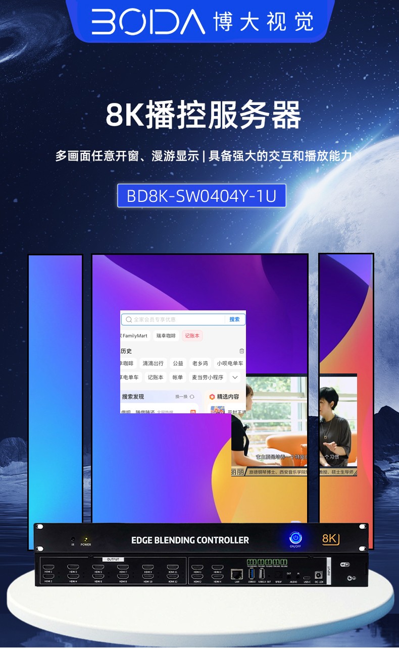 公司专为LCD、LED小屏显示推出的一款专业的8K播控服务器,集多媒体播控、信息发布、集群管理功能和应用平台为一体,具备强大的交互和播放能力。 支持Windows、Mac OS、iOS、Android多平台终端控制,可实现多画面任意开窗、 漫游显示。同时针对不同应用场景需求,支持对接视频会议系统、监控系统、网络直播、 本地媒体播放,提供2种场景模式(桌面模式、开窗模式),让文档演示、视频播放、远程会议,都能匹配最佳显示效果。 产品支持红外遥控、鼠标、平板、手机、电脑控制,可以广泛用于政企、酒店设计、医疗、教育等行业的商显场景。