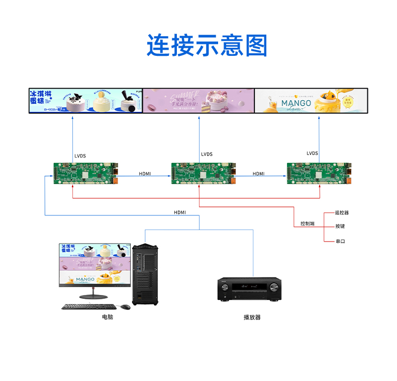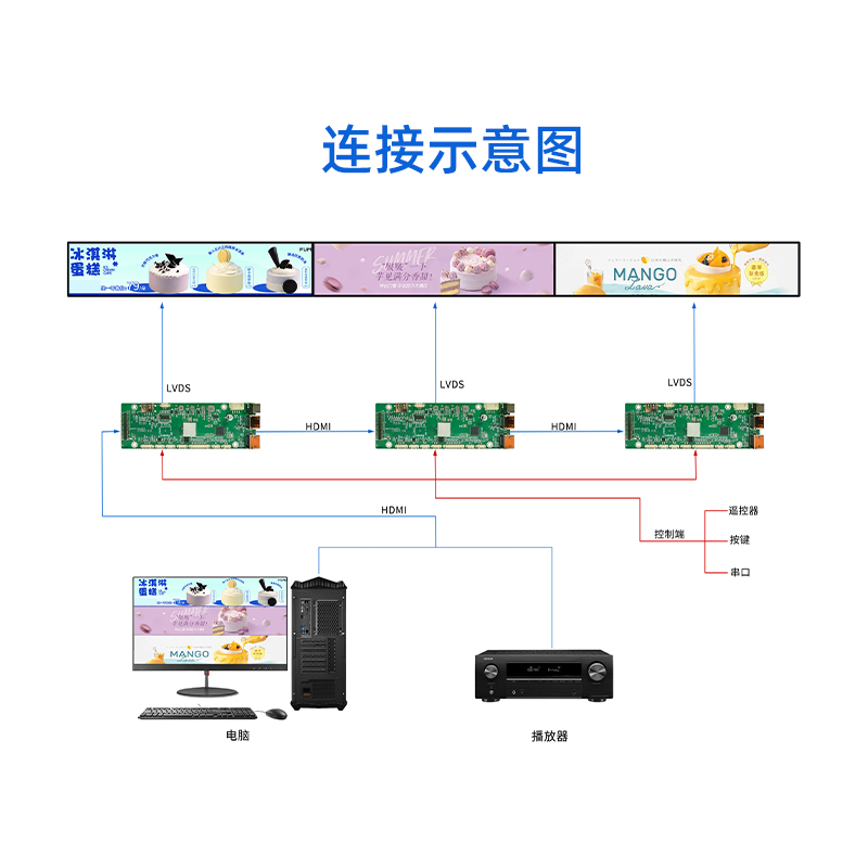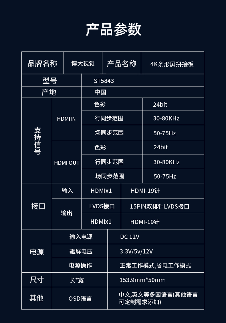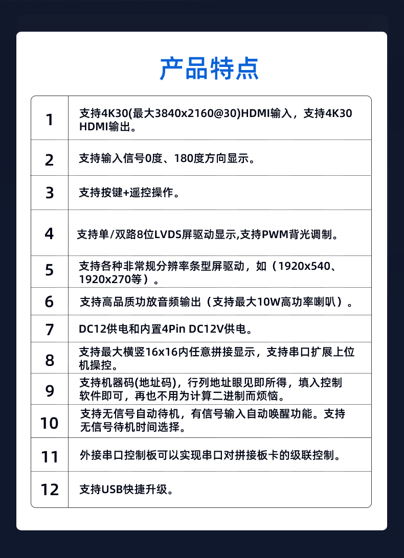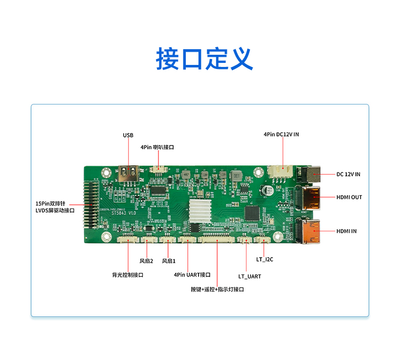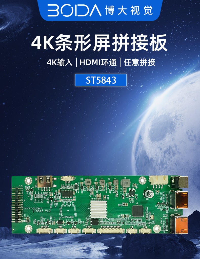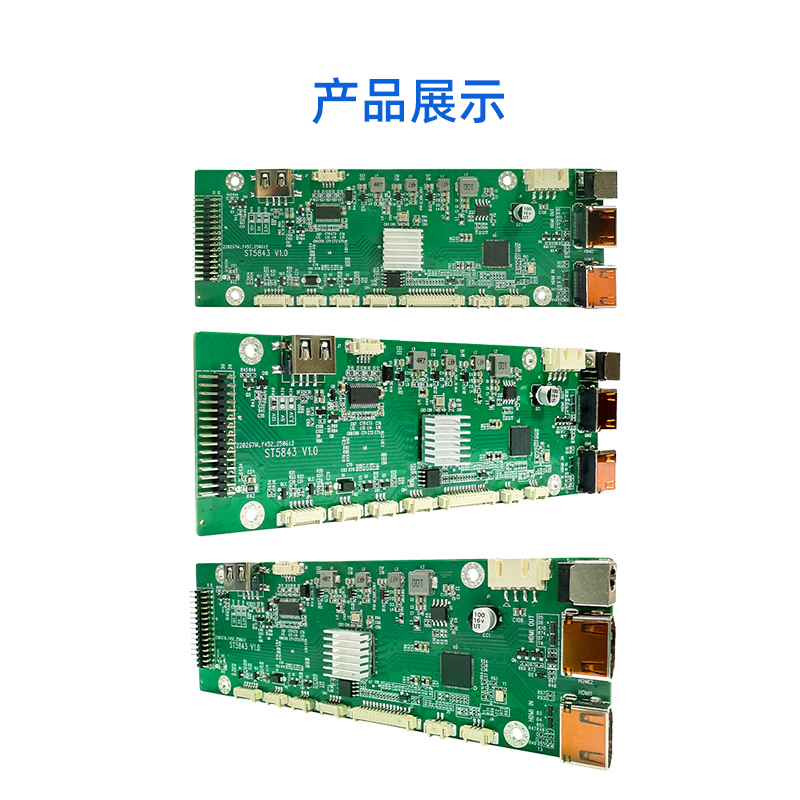 ST5843板卡是一款全面高性能的条形屏拼接显示驱动板。内含强大的视频处理功能,能输出高质量的画面。支持 HDMI接口输入,支持输入转HDMI输出,支持最大3840×2160@30HZ(HDMI信号)以内高清信号输入输出,支持双路8位LVDS屏幕驱动显示,提供更好效果并提供逐行的高清晰的视频显示,支持高品质功放音频输出。板卡还集成了自动温控、LED指示灯、按键、遥控等便捷功能。