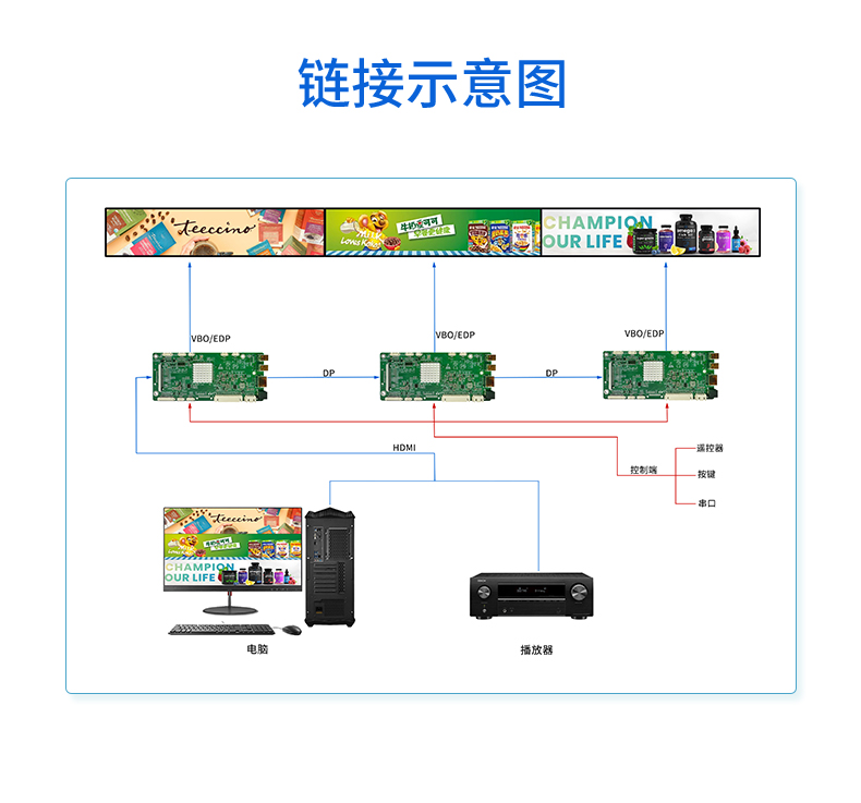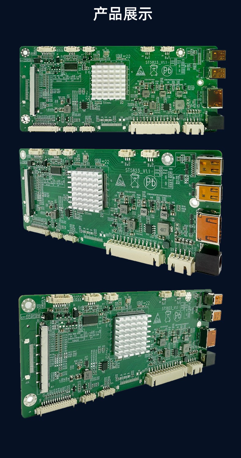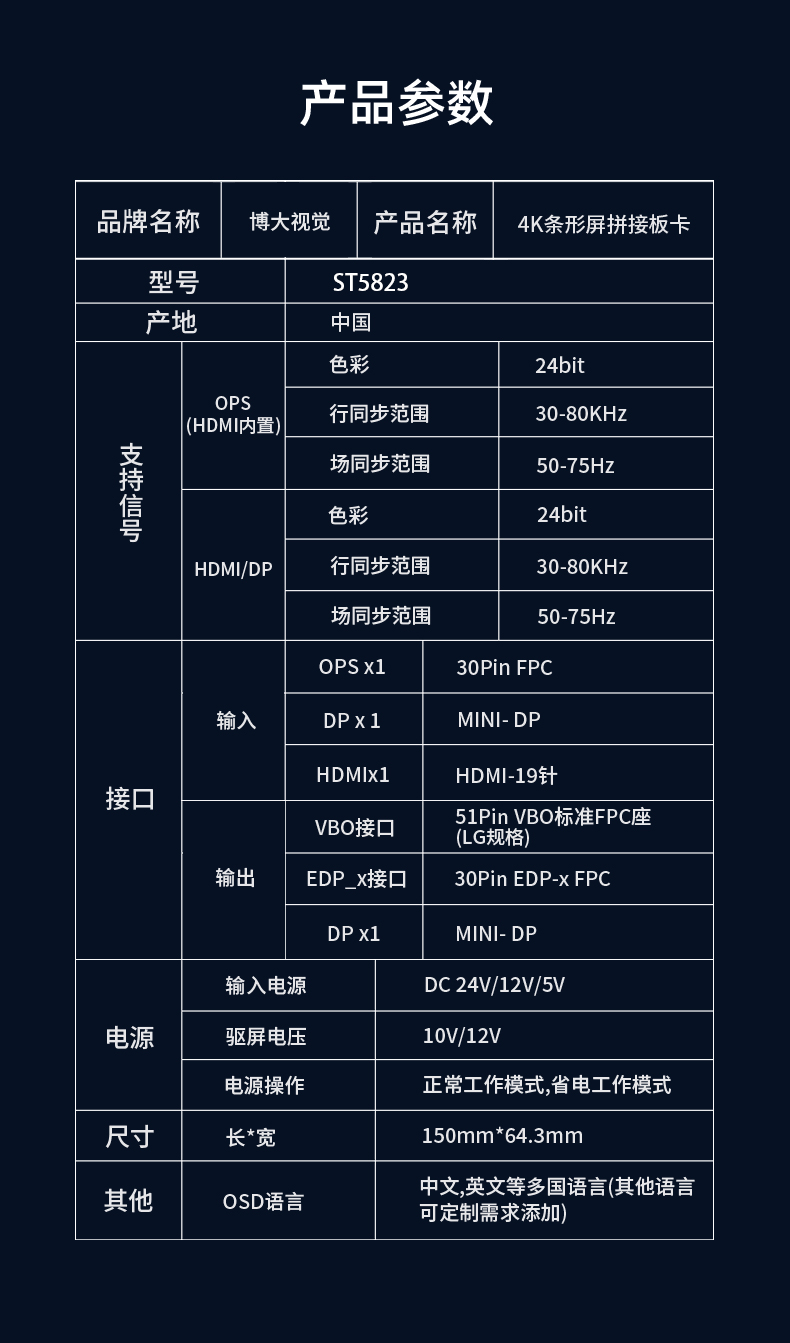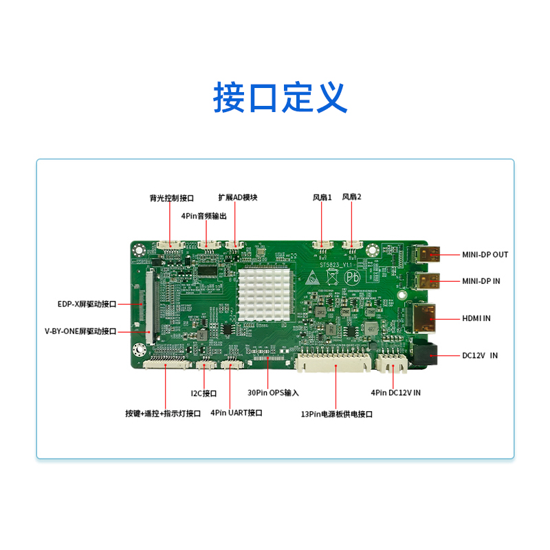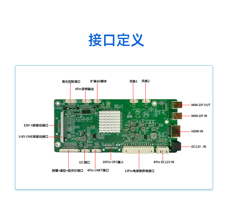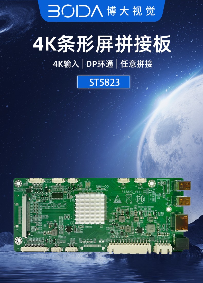 ST5823是一款全面高性能的条形屏拼接显示驱动板。内含强大的视频处理功能,能输出高质量的画面。支持DP(MINI), HDMI,内置OPS(可选)等接口输入,支持任意输入转DP(MINI)输出,支持全4096×2160@60HZ(HDMI/DP信号)以内高清信号输入输出,支持4K超高清 V_BY_ONE/EDP_x(可选)屏幕驱动显示,提供更好效果并提供逐行的高清晰的视频显示,支持高品质功放音频输出。板卡还集成了自动温控、LED指示灯、按键、遥控、光控等便捷功能。