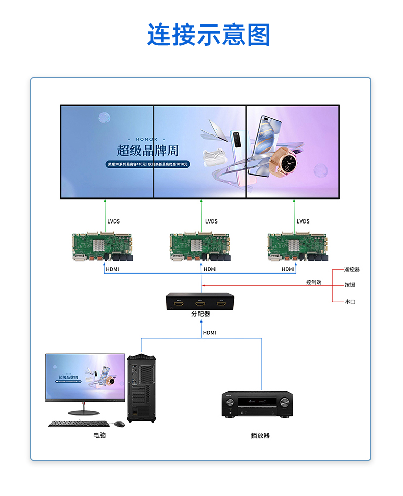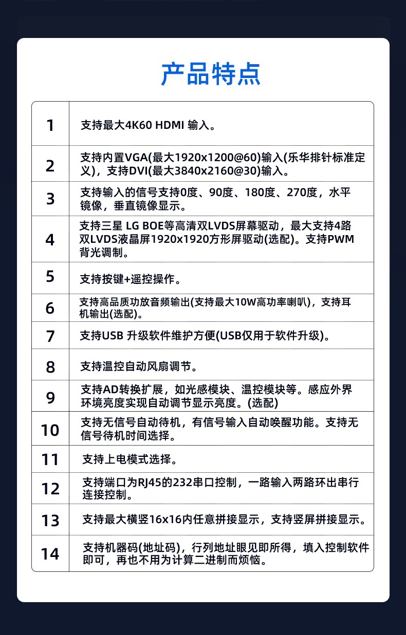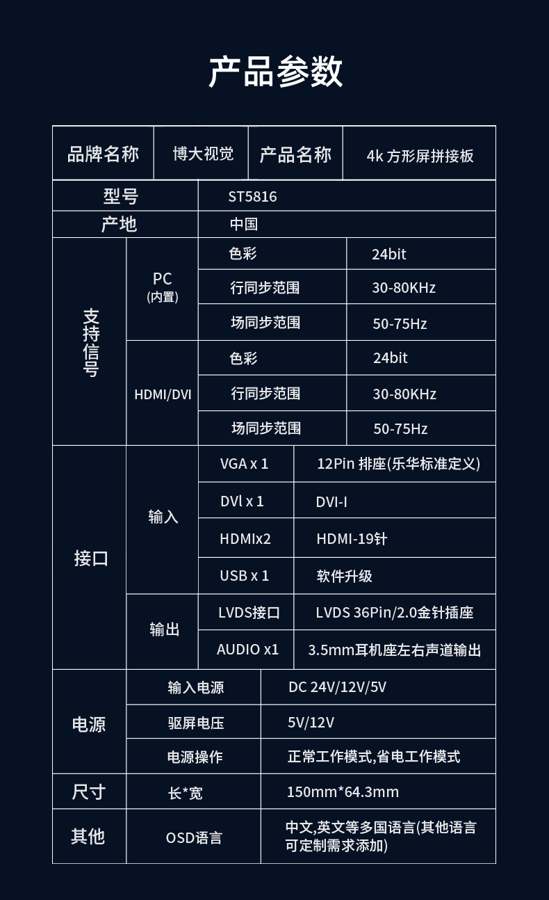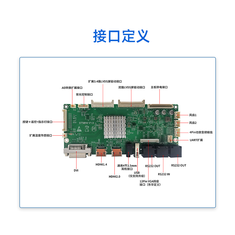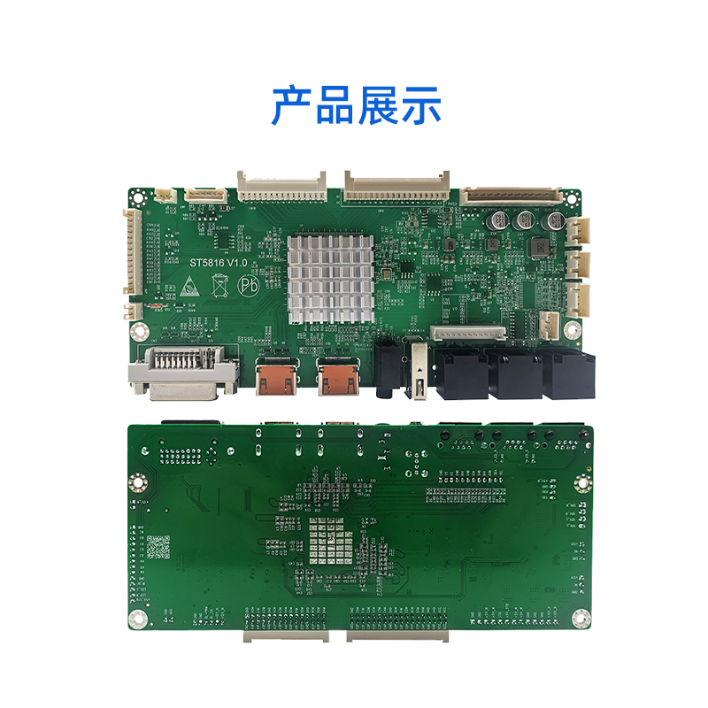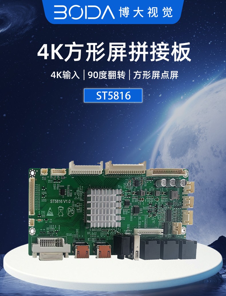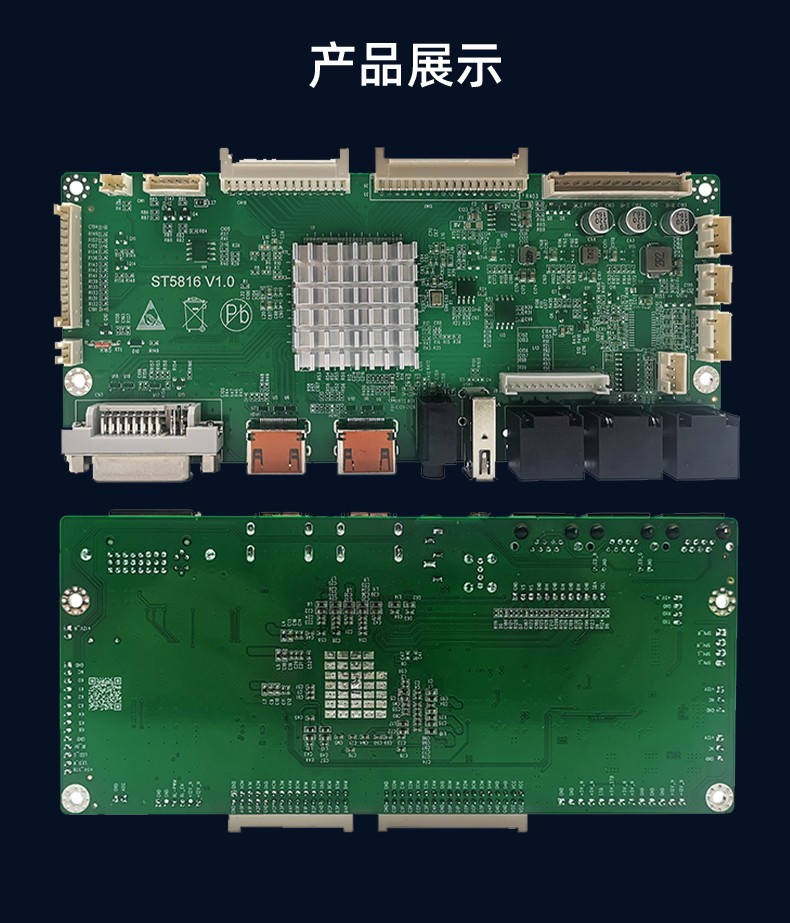 ST5816是一款全面高性能的专门为方形屏圆形屏设计的拼接显示驱动板。内含强大的视频处理功能,能输出高质量的画面。提供VGA(内接), HDMI,DVI等接口,支持1080P(VGA信号)以内的输入,支持3840×2160@60HZ(HDMI信号)以内高清信号输入,在2x2 HD高清拼接达到点对点效果,达到更好显示效果并支持逐行的高清晰视频流,支持高品质功放及耳机的音频输出。该板卡还集成了温控、LED指示灯、按键、遥控,光控等便捷功能。