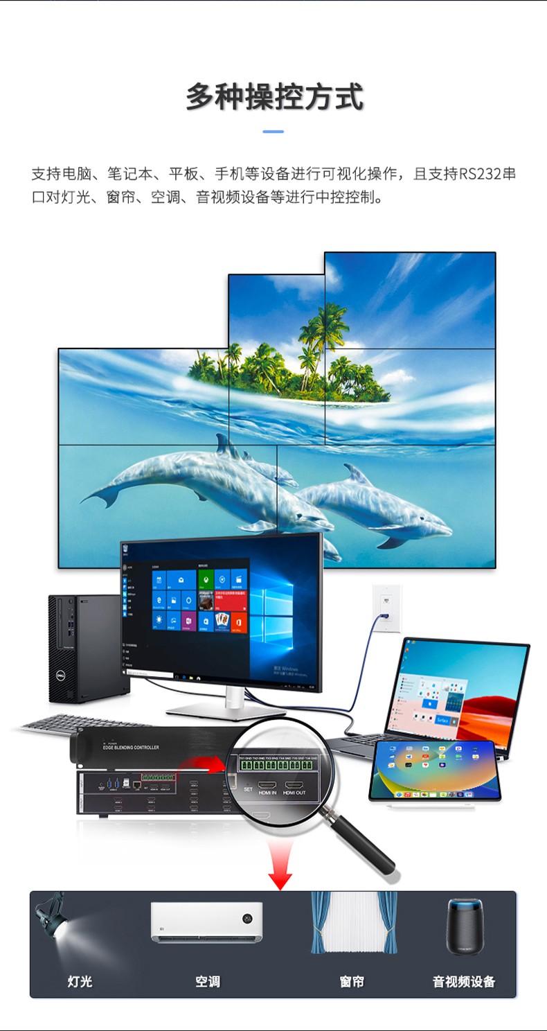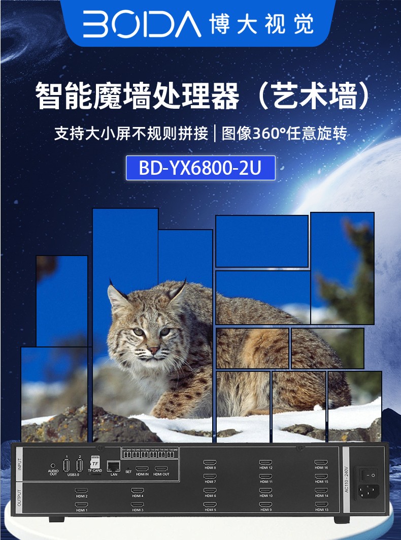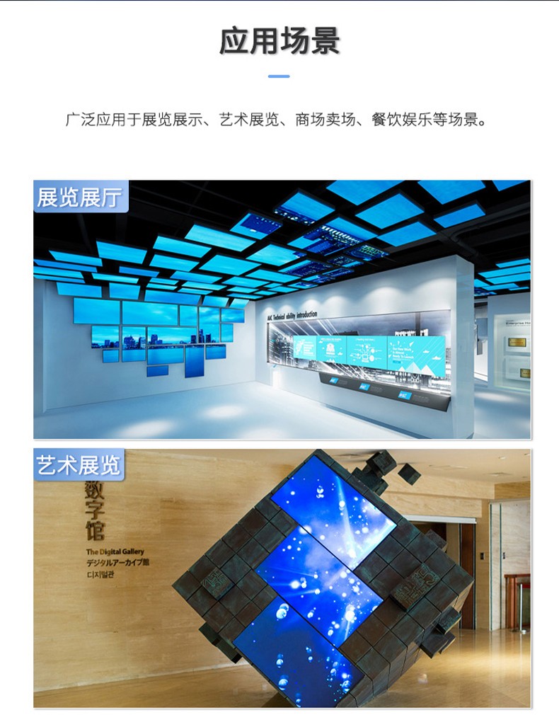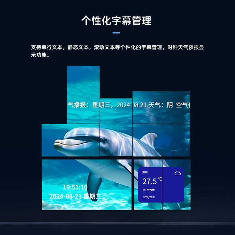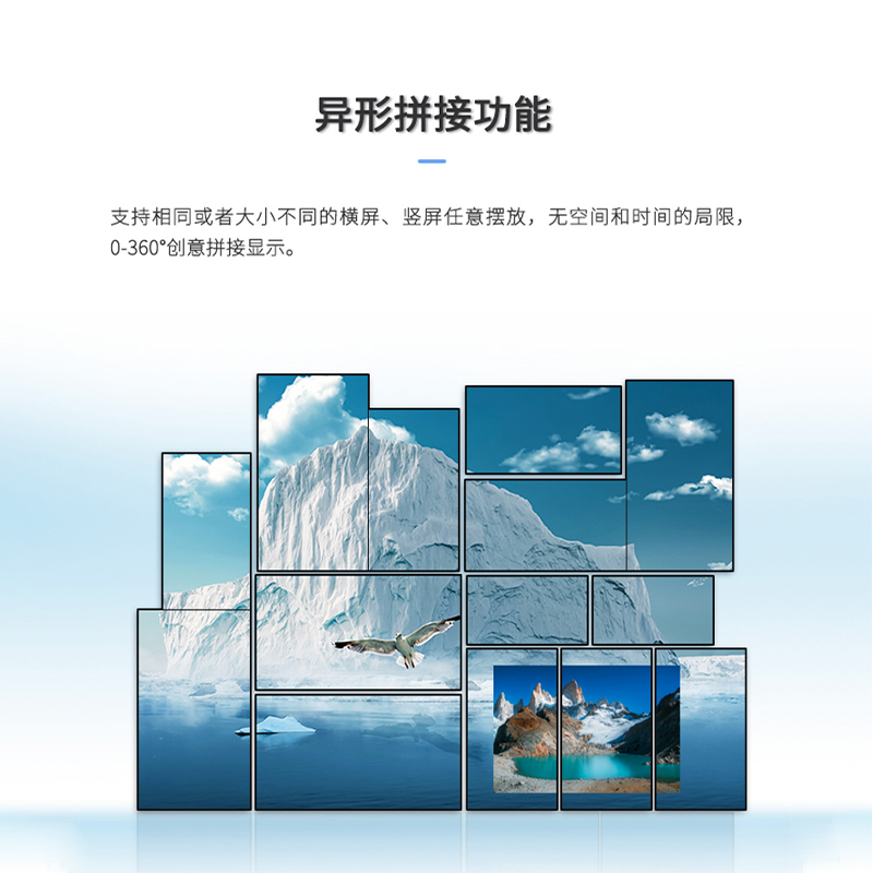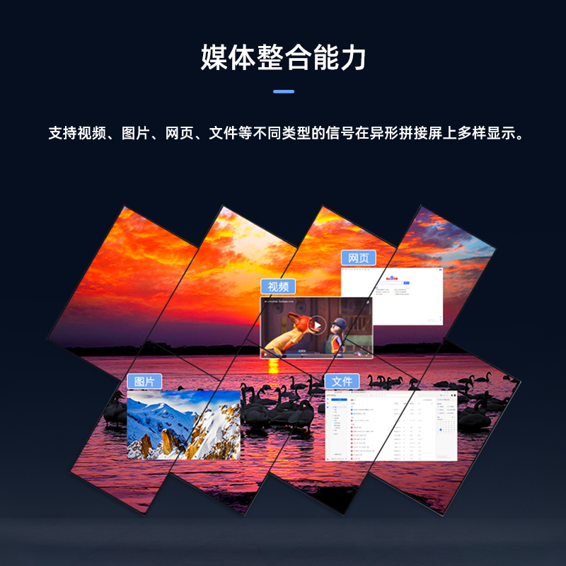智能魔墙处理器(艺术墙)是专门用于实现异形拼接屏功能的设备,支持不规则或异形的显示屏拼接,满足特殊展示需求,提供更加灵活和创意的展示方式。设备集多媒体播控、信息发布、集群管理功能和应用平台为一体,具备强大的交互和播放能力,适用于会议室、展览展示、广告宣传等多种场合。