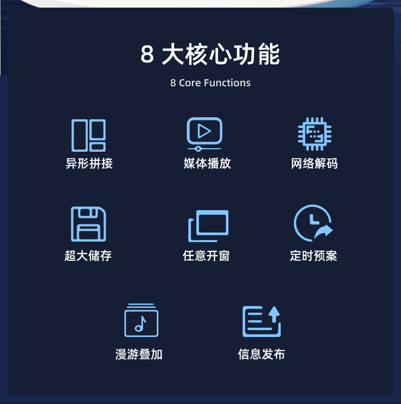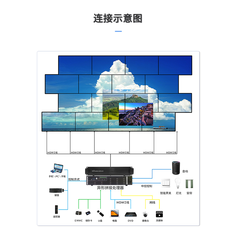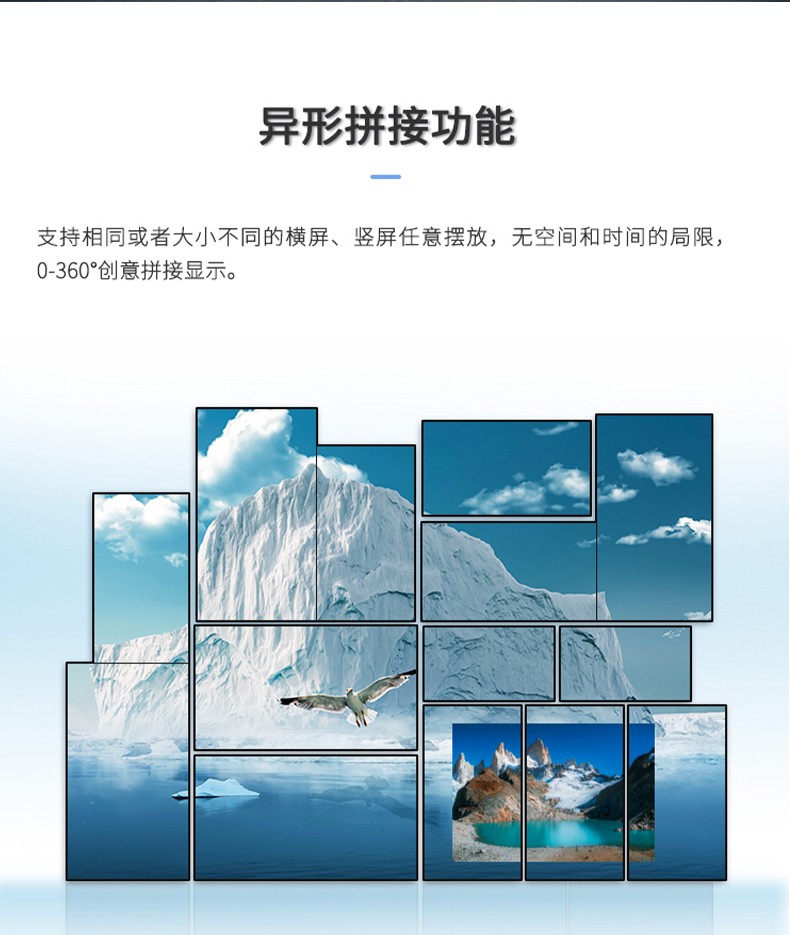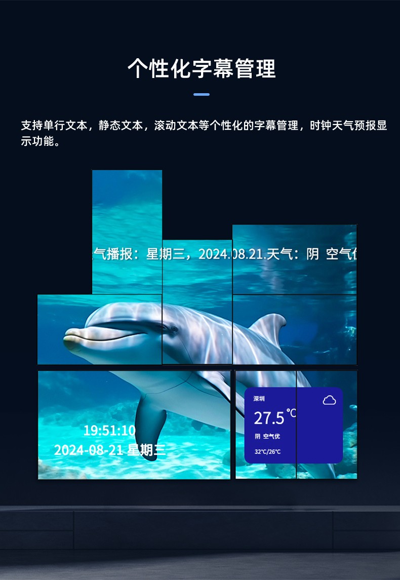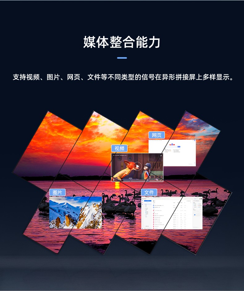 智能魔墙处理器(艺术墙)是专门用于实现异形拼接屏功能的设备,支持不规则或异形的显示屏拼接,满足特殊展示需求,提供更加灵活和创意的展示方式。设备集多媒体播控、信息发布、集群管理功能和应用平台为一体,具备强大的交互和播放能力,适用于会议室、展览展示、广告宣传等多种场合。
