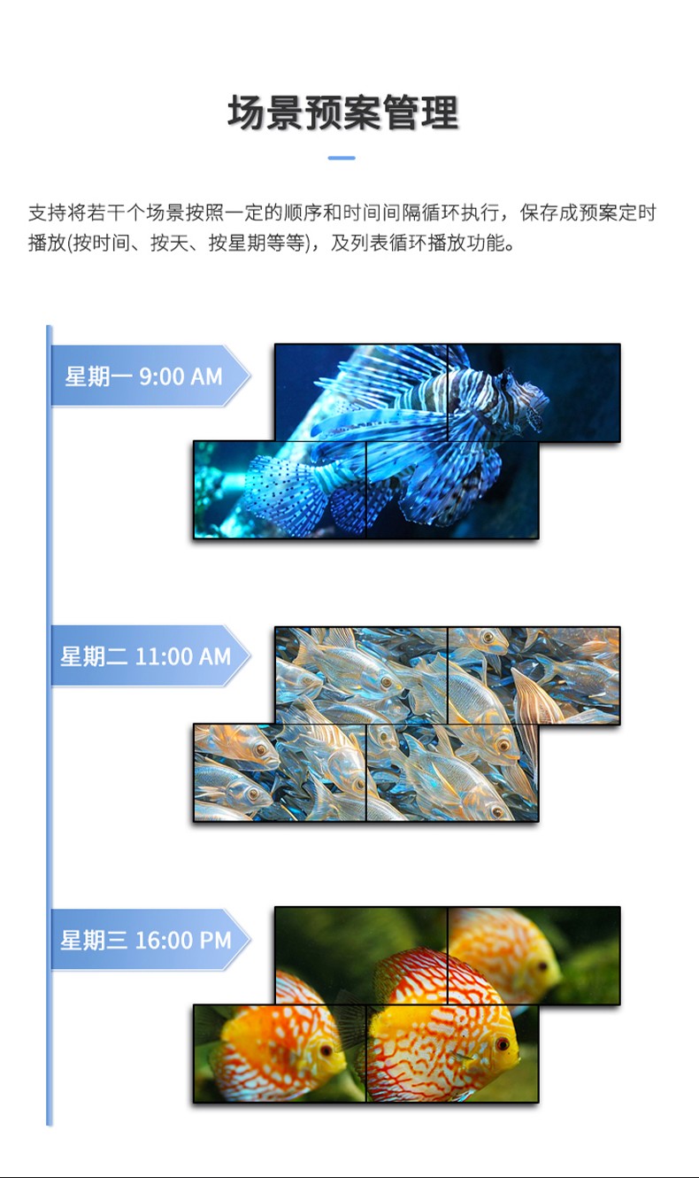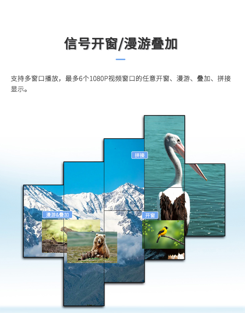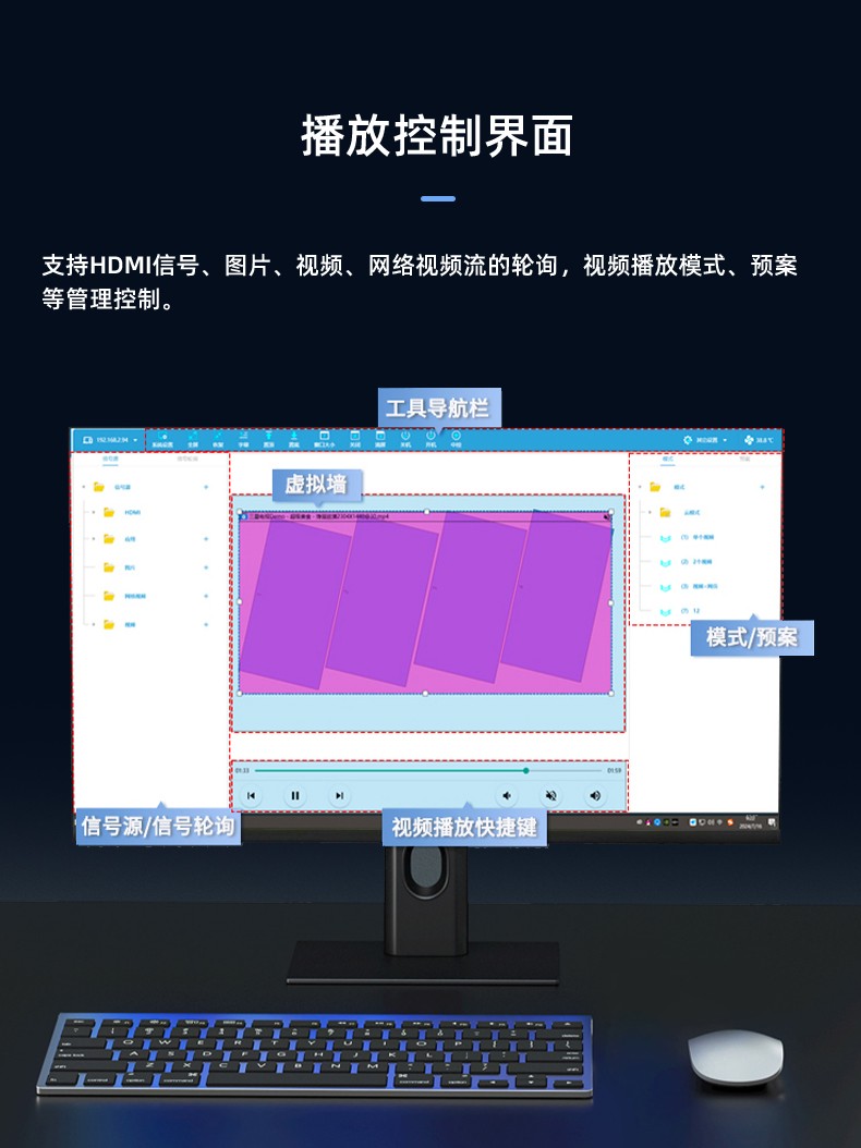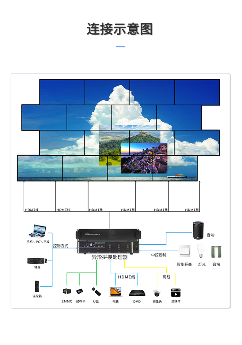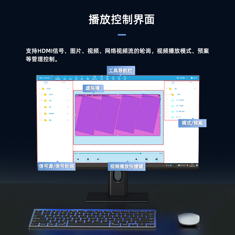智能魔墙处理器(艺术墙)是专门用于实现异形拼接屏功能的设备,支持不规则或异形的显示屏拼接,满足特殊展示需求,提供更加灵活和创意的展示方式。设备集多媒体播控、信息发布、集群管理功能和应用平台为一体,具备强大的交互和播放能力,适用于会议室、展览展示、广告宣传等多种场合。