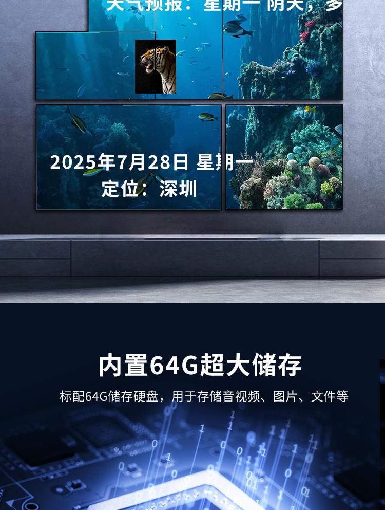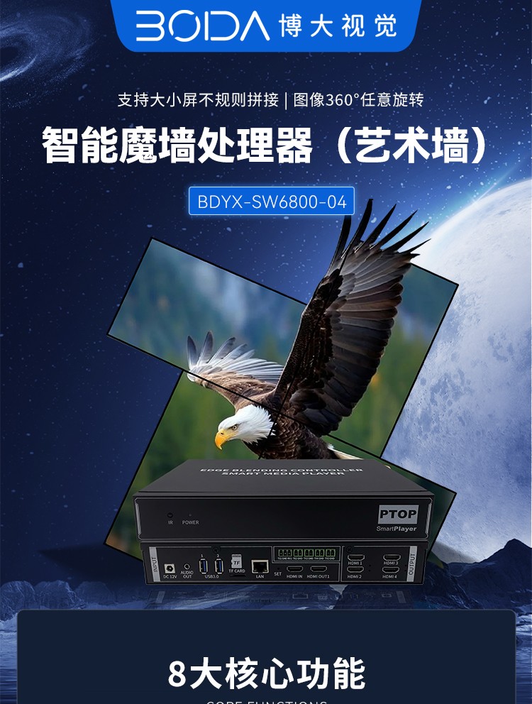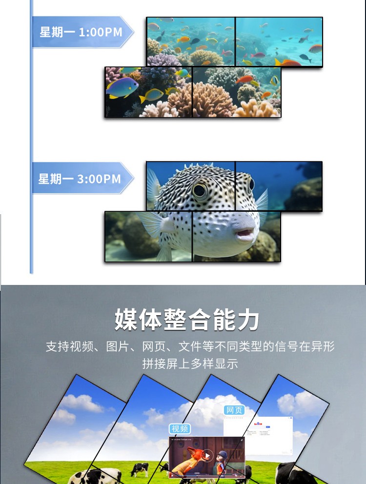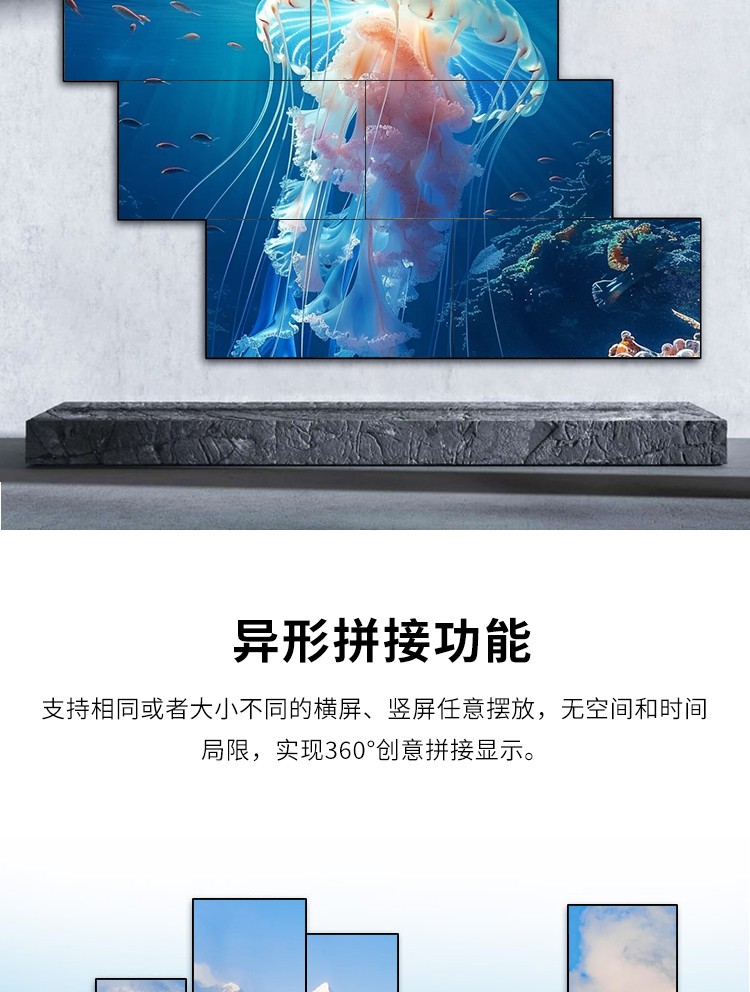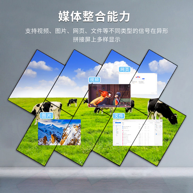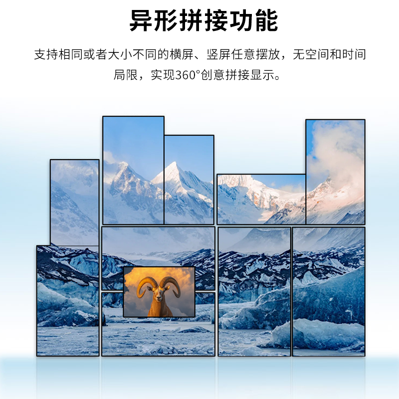 智能魔墙处理器(艺术墙)是专门用于实现异形拼接屏功能的设备,支持不规则或异形的显示屏拼接,满足特殊展示需求,提供更加灵活和创意的展示方式。设备集多媒体播控、信息发布、集群管理功能和应用平台为一体,具备强大的交互和播放能力,适用于会议室、展览展示、广告宣传等多种场合。