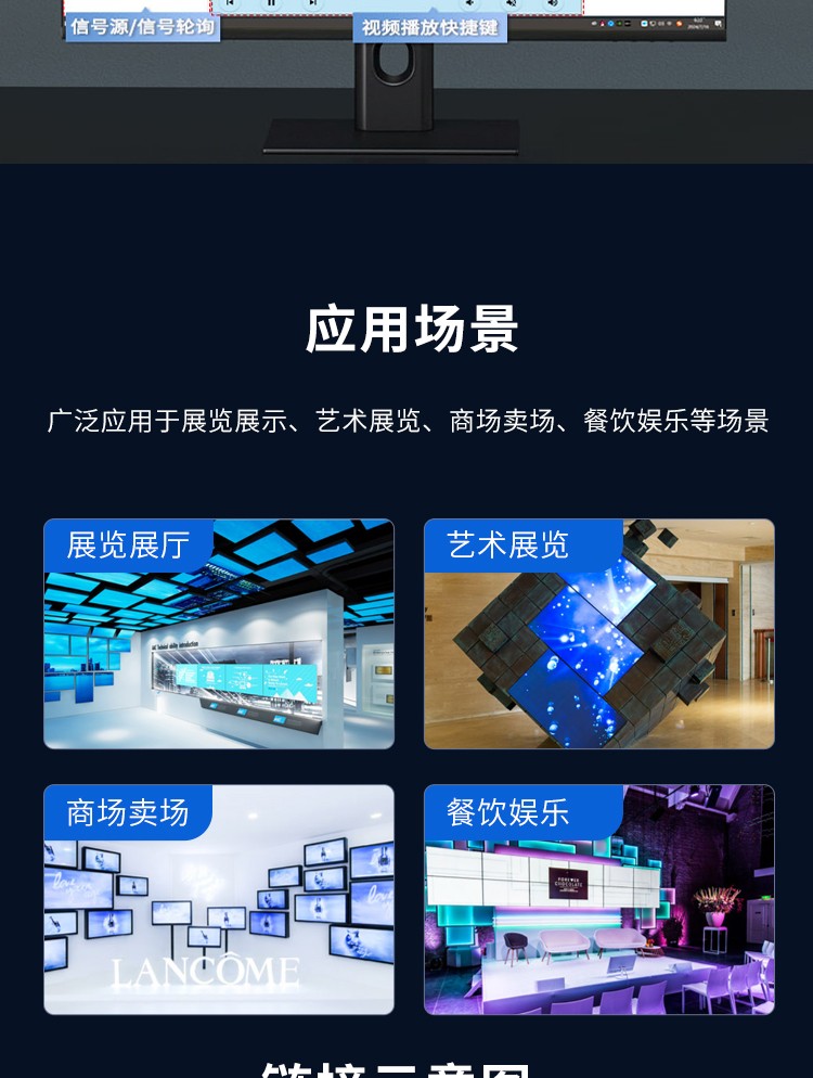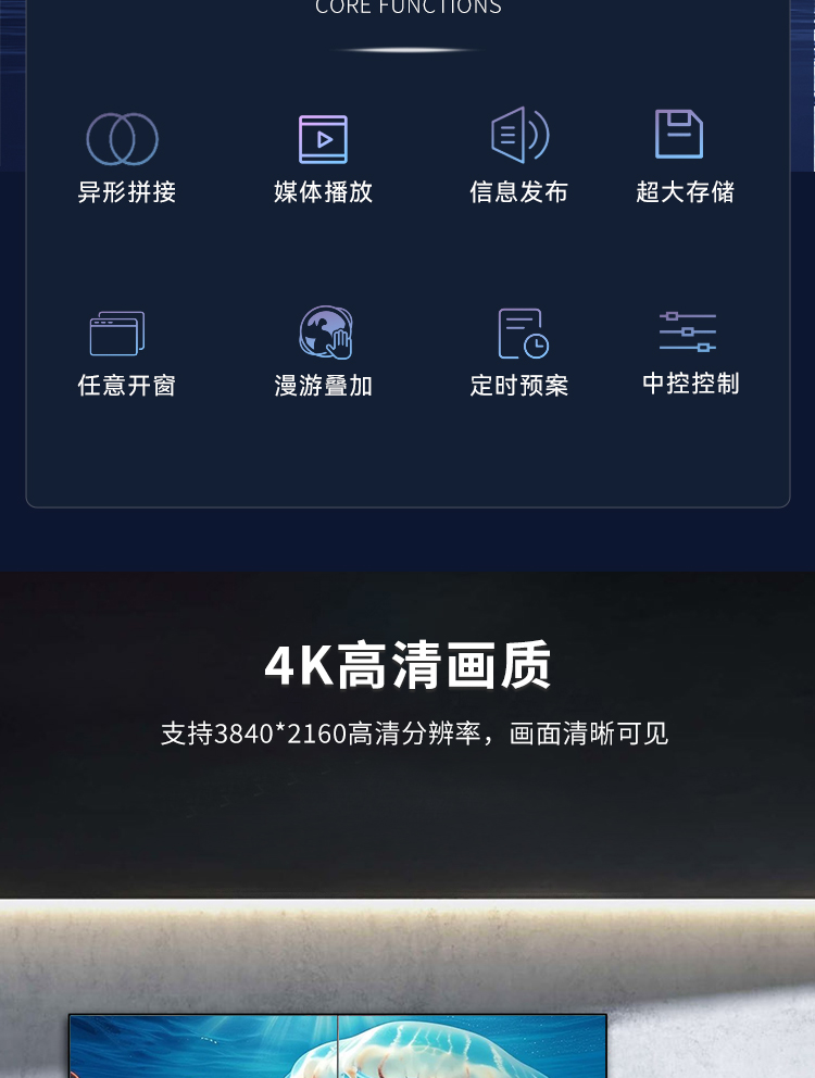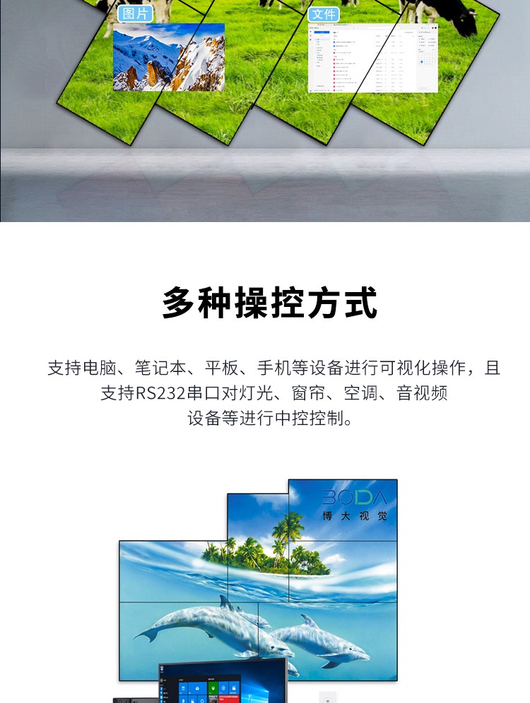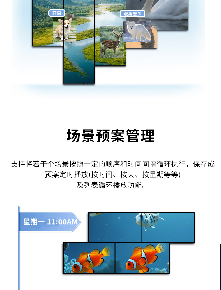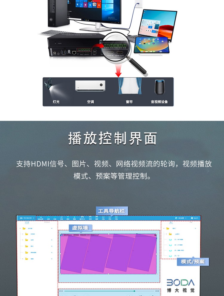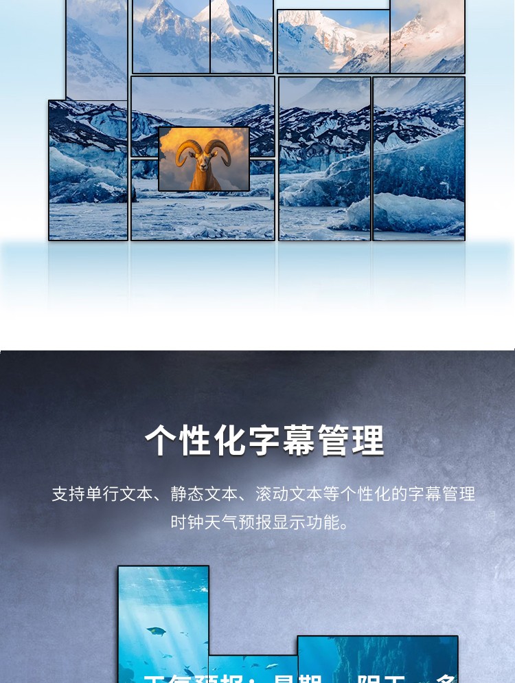 智能魔墙处理器(艺术墙)是专门用于实现异形拼接屏功能的设备,支持不规则或异形的显示屏拼接,满足特殊展示需求,提供更加灵活和创意的展示方式。设备集多媒体播控、信息发布、集群管理功能和应用平台为一体,具备强大的交互和播放能力,适用于会议室、展览展示、广告宣传等多种场合。